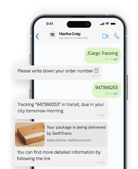 - Integration with the CRM system of your choice: receiving order statuses from CRM to the chat bot, adding a new request from the chat bot to the CRM.
