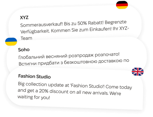 Надсилайте повідомлення по всьому світу без зайвих зусиль у понад 180 країн та на номери 1000+ операторів. Розширюйте свою глобальну присутність за допомогою нашого комплексного сервісу. Безперешкодно спілкуйтеся з клієнтами, де б вони не знаходилися.